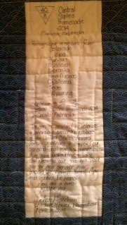 At the top, back, is a tribute written especially for the Central States Promenade 2014. (Please excuse the quality of the photo. It is written on white Kona fabric, but the photo makes it appeared yellowed.)